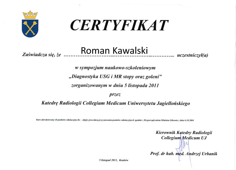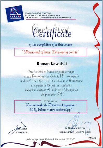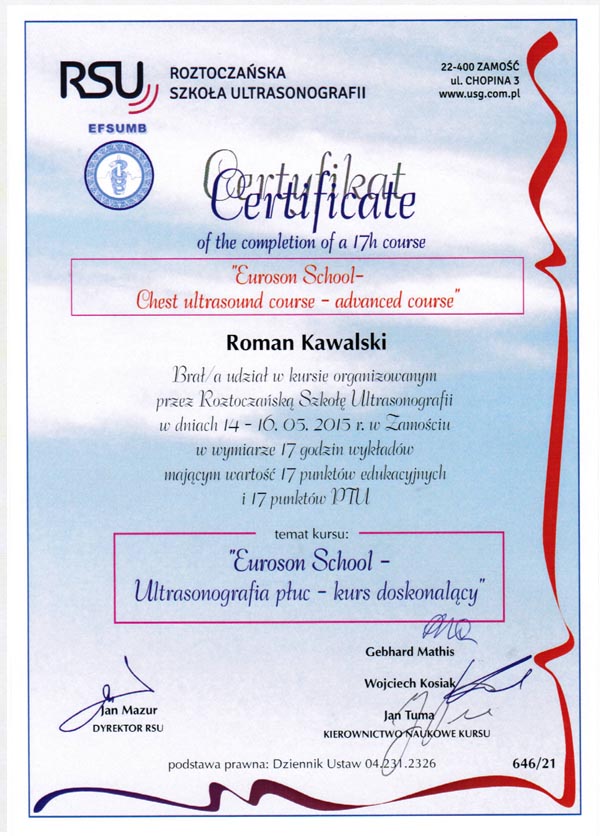 Poradnia Lekarza Rodzinnego Żerniki od lat oferuje badania USG. Poniżej zostały przedstawione certyfikaty, potwierdzające wiedzę oraz kwalifikacje zdobyte przez lek.med. Romana Kawalskiego.